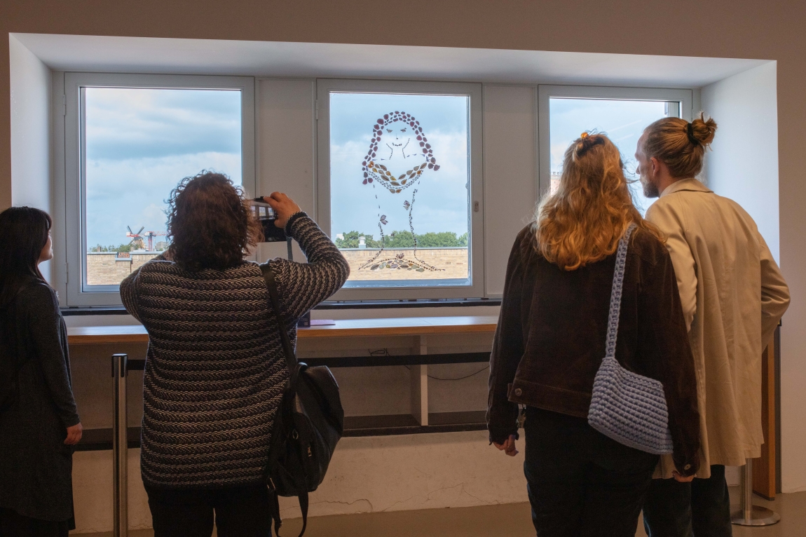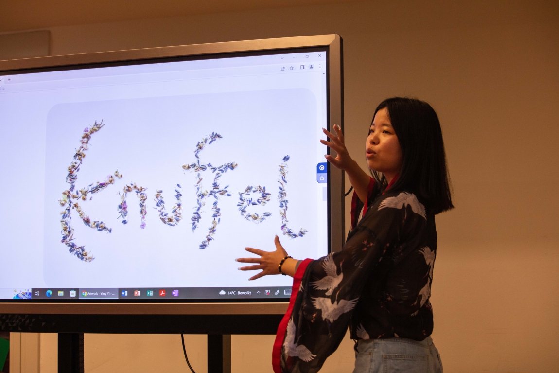 The artwork ‘Knuffel’ is delicately connected to a big glass window with a beautiful skyline of Utrecht. During the exhibition period, I organise as well as participate in a few special events around ‘Knuffel’. I host the opening and a series of one-to-one tea ceremonies on September 17th, 2022. On October 18th, 2022, I gave a tour within HKU Talk ‘Because We Care’.
