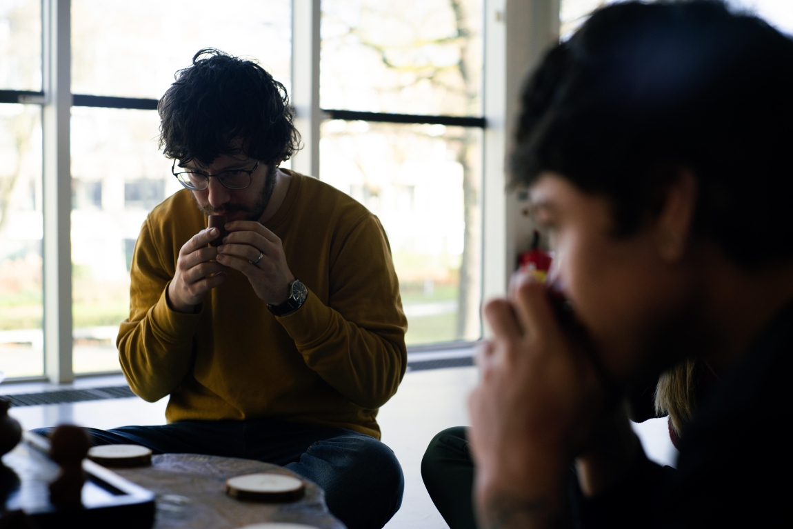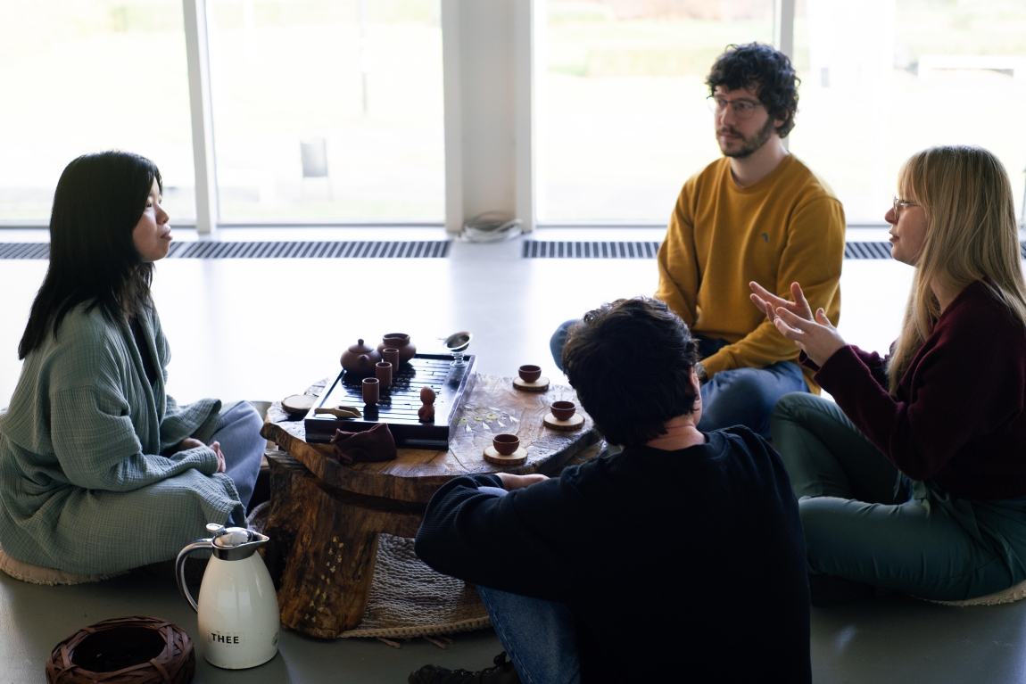 Travel Tea Table, a tailor-made art installation specially for interactive and intimate tea rituals, crafted from a roughly century-old Maple tree from Oudegracht, Utrecht. The low tea table, enriched with local botanical highlights and a 360-degree rotating panel, invites play, mindfulness, and connection.